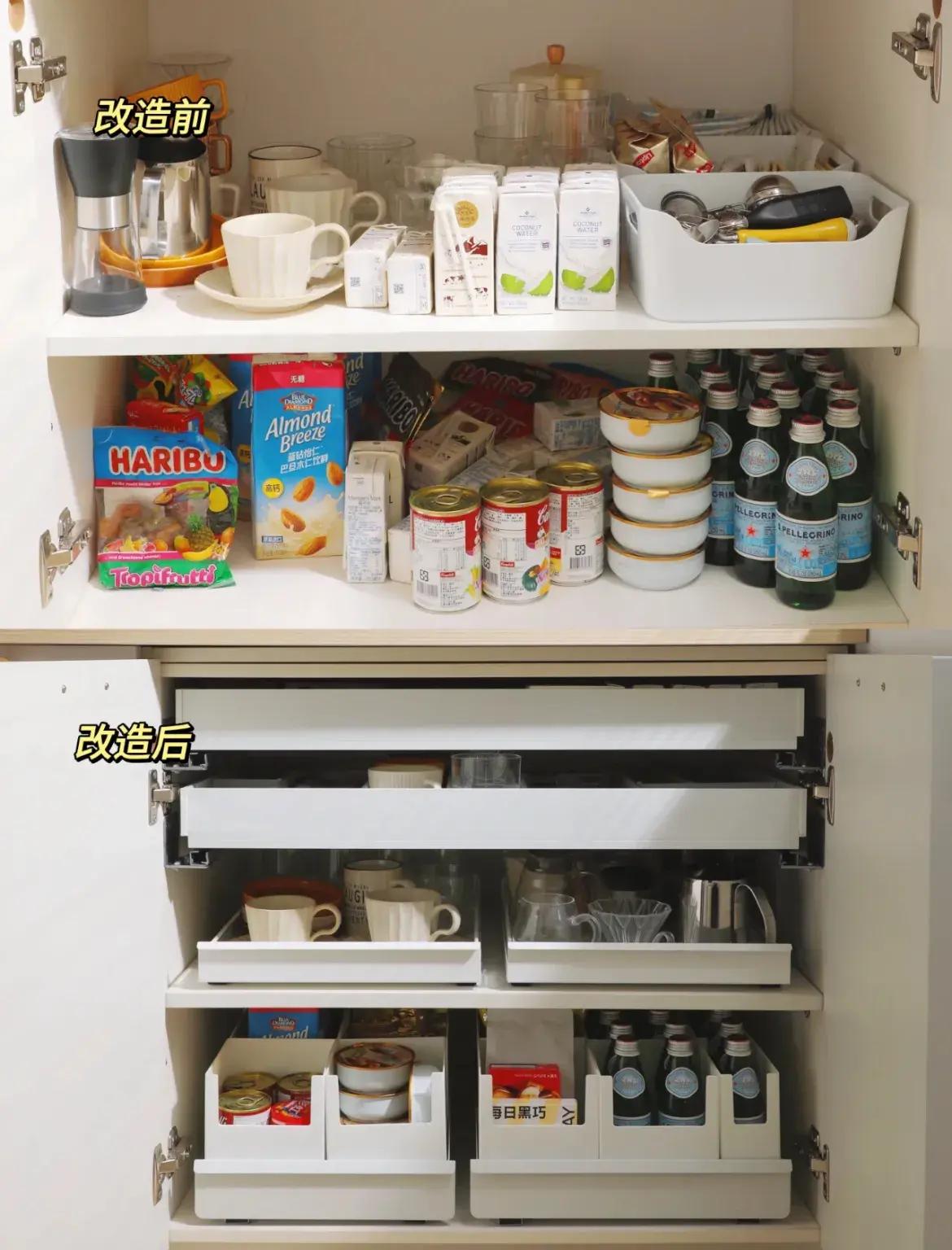 改造後的櫥櫃,多層內抽,根據物品大小,層層擺放,不僅整齊,拿取還很方便,這點值得驕傲。