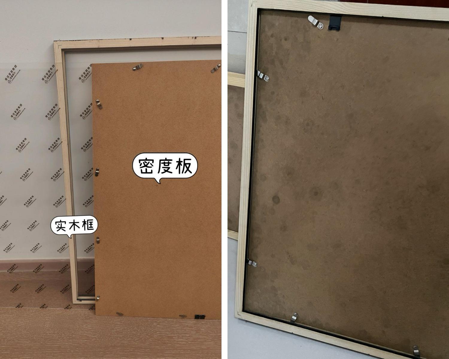 但問題是不合格的產品市面上也有不少,像網購的廉價畫框裏面,主要材料就是密度板,這些密度板都是三無產品,商家完全無法提供質檢報告或環保檢測報告,很容易大量釋放有害揮發氣體導致室內空氣污染物超標,如果家裏潮溼的話,還很容易發黴變形。