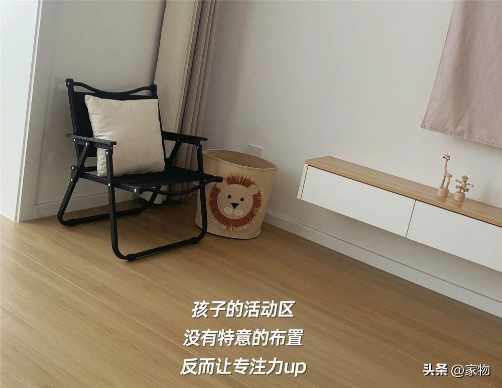 同樣是在家裏的客廳,我還給孩子留出了一個小小的活動角,這片區域我沒有特意去佈置,只是放了他的小凳子和玩具桶,你別說,反而能讓他更專注自己的活動,不被一些外物所影響,挺好的。