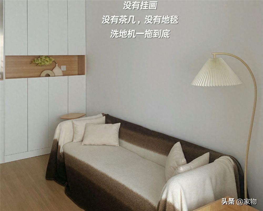 牆面掛畫是個人選擇,而我選擇不掛畫,保持牆壁的留白,與此同時,在我家客廳消失的還有茶几地毯,現在家裏客廳除了沙發就是邊幾和落地燈。