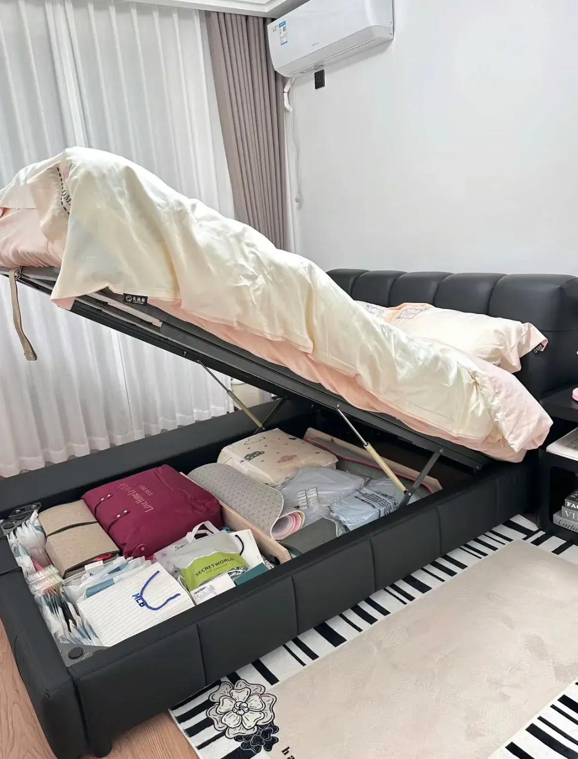 比如落地箱牀,增加收納空間,牀品、被子等大件放在裏面,省得佔用衣櫃空間。