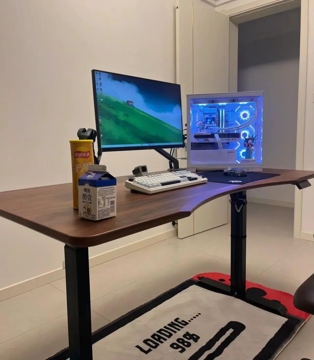 桌子能靠牆時相對簡單,顯示屏幕和主機都放桌面,稍微調整下線的角度,達到正面隱形的效果即可。