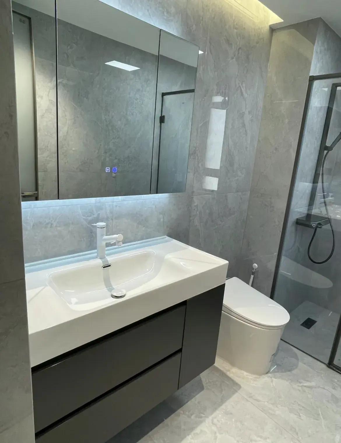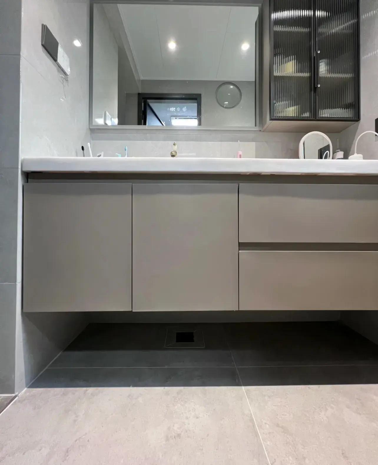 浴室櫃選擇懸空的之後,排水管配套的也要做牆排,高度控制在浴室櫃能遮擋的位置,日常看不見,才能算真正意義上的“空”。