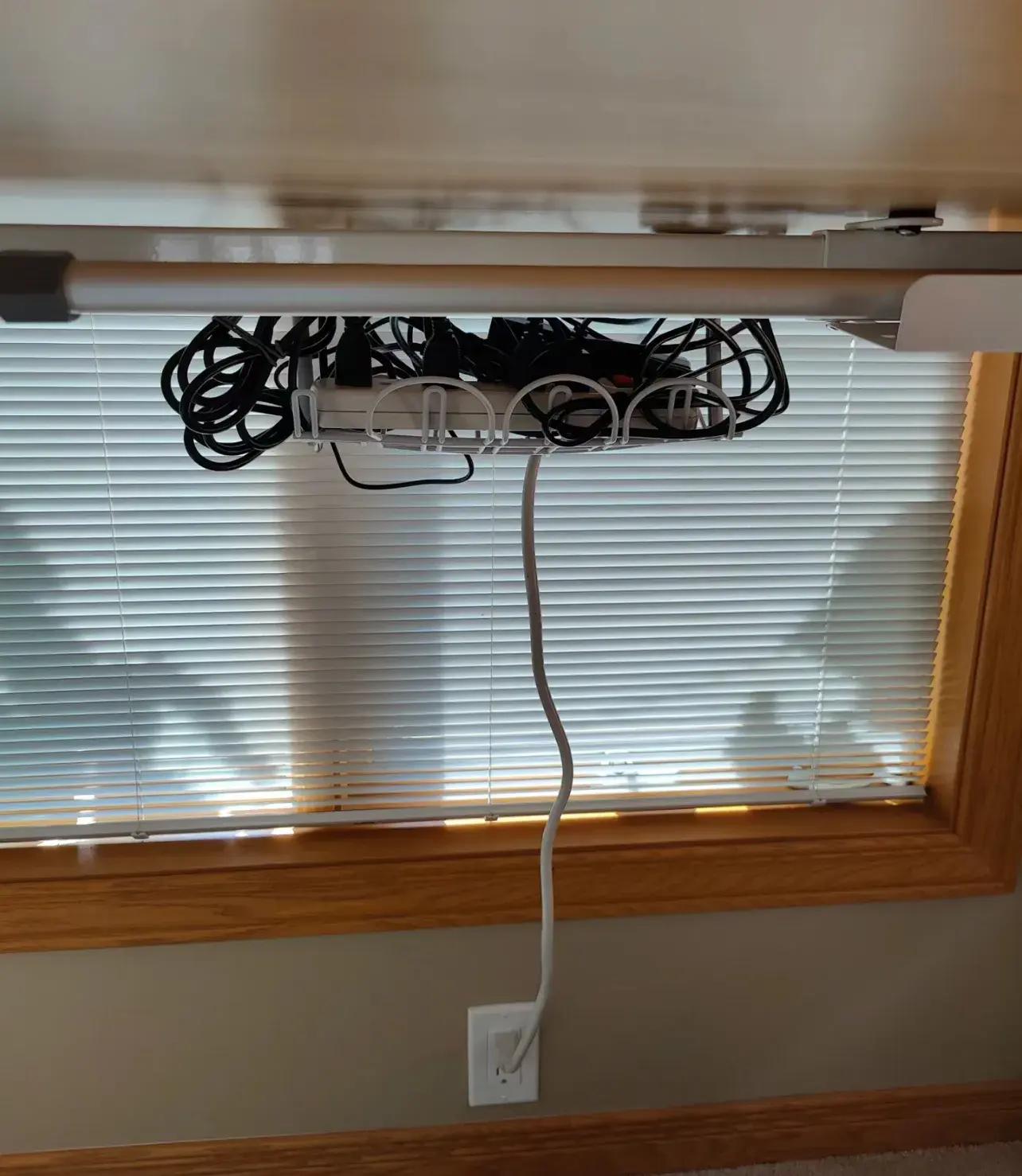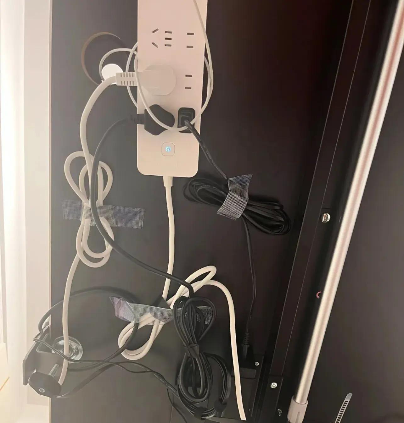 插線板的線,可以順着桌腿順上去,與桌腿同色的單根線,又在桌腿內側,基本也能隱形。
