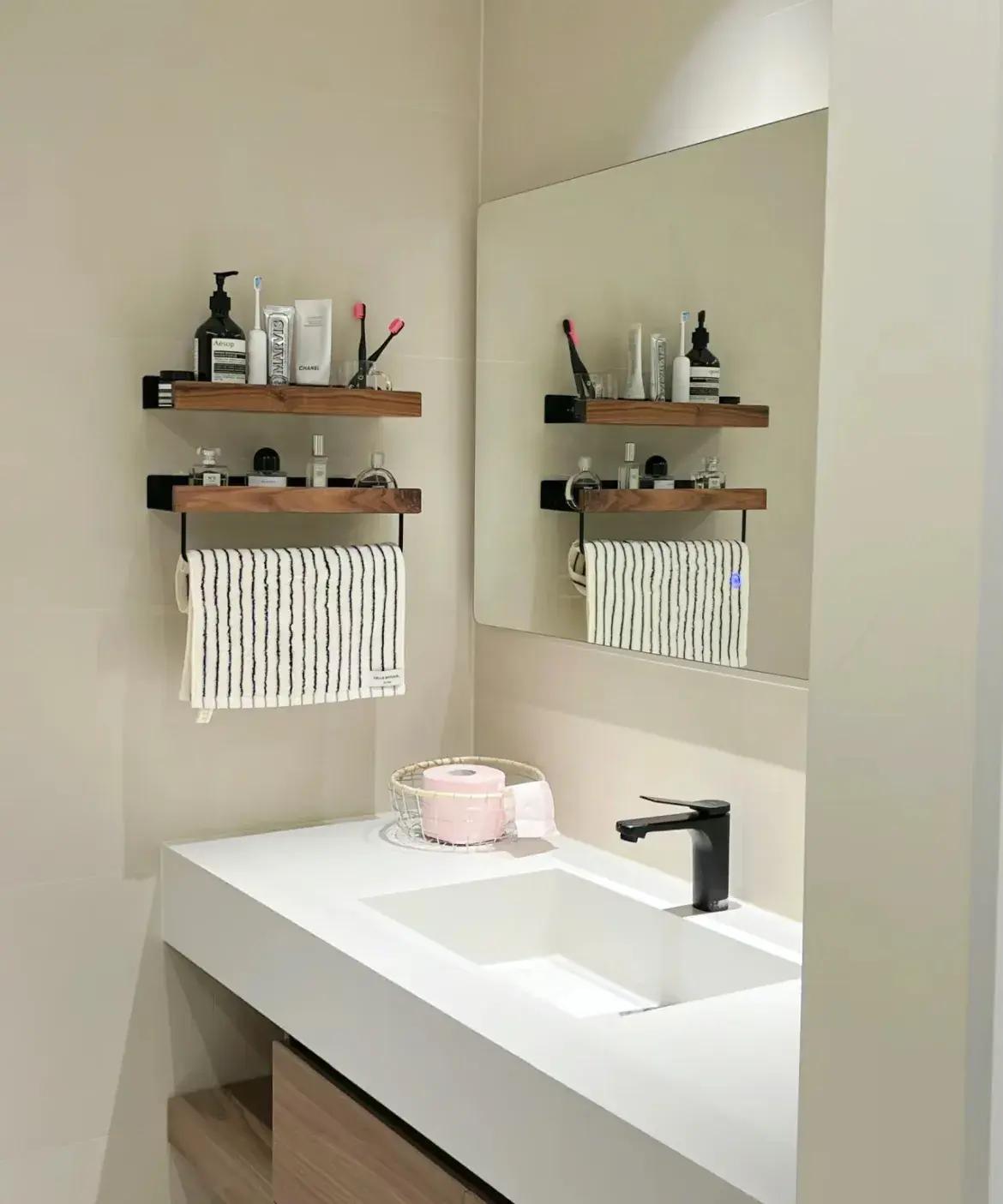 針對有儲物空間,但是懶得開櫃門、關櫃子拿、放的一類人,面盆一側安裝一兩層壁掛置物架,高頻物品放在上面,也能避免東西堆在臺面。
