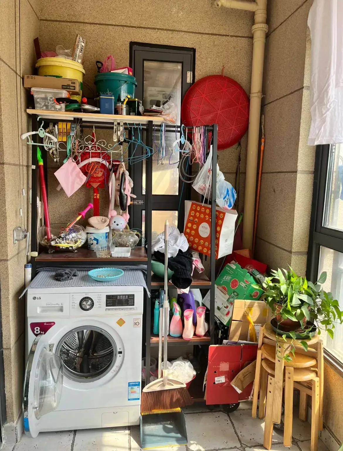 比如陽臺區域,本身只是洗衣機,隨着入住時間的延長,很難不成爲雜物堆放地。