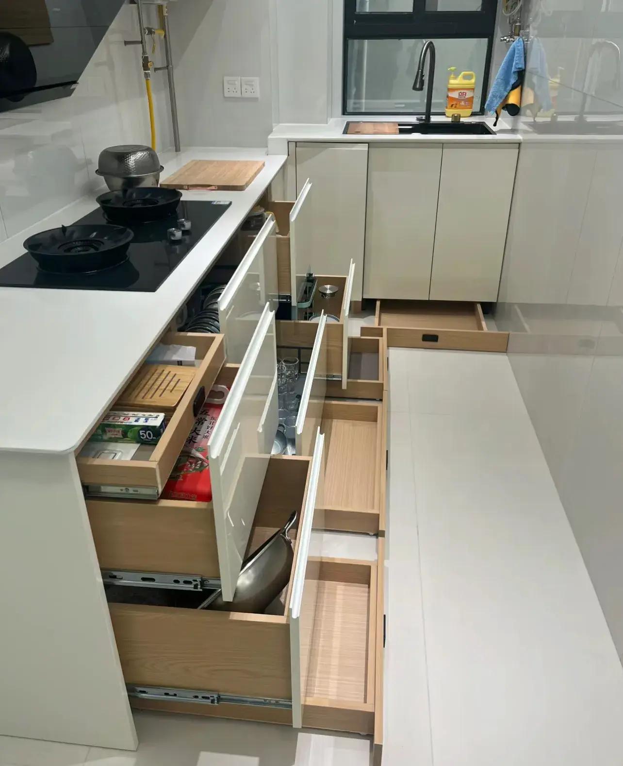 廚房的小零碎多,抽屜收納這類物品絕對比層板櫥櫃利用率高,而且抽拉拿取更方便。