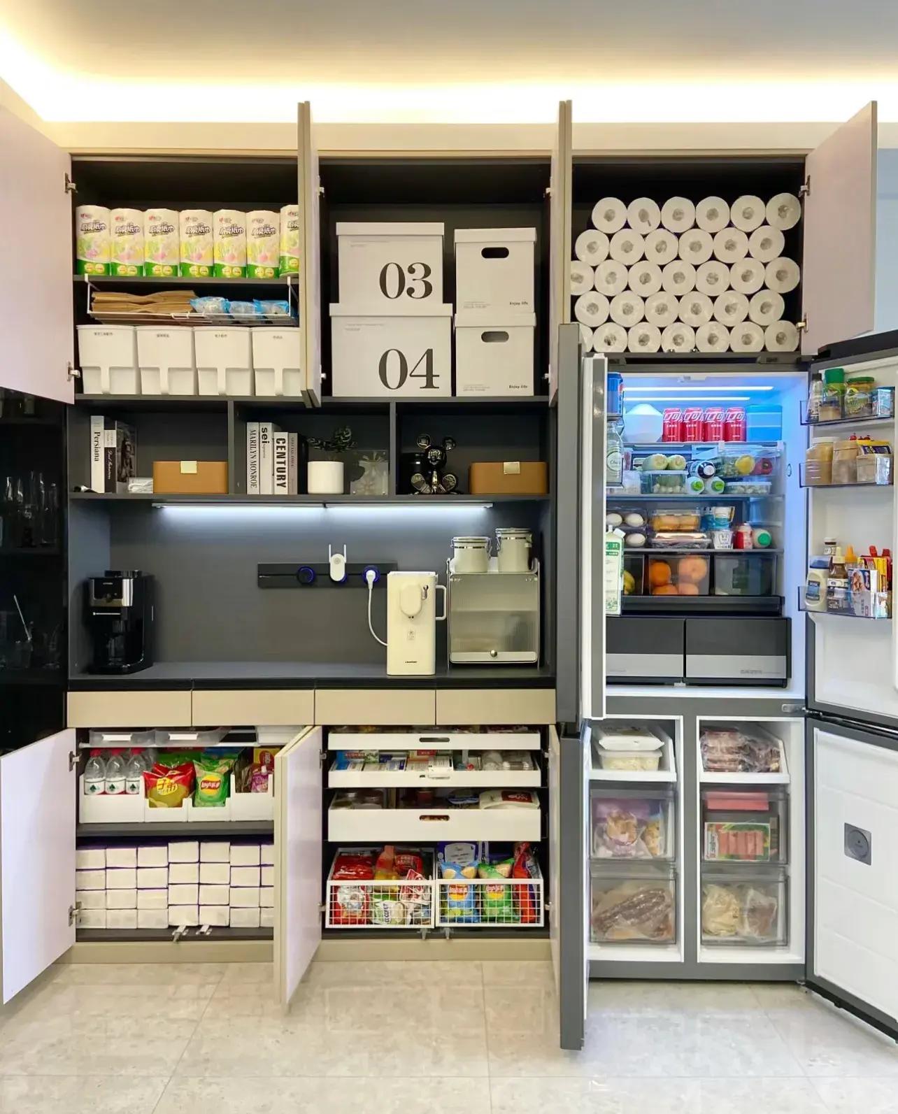 所有餐桌周邊的用品、器具,都可以塞進餐邊櫃裏,還能分擔點家庭囤貨收納,使家裏更整潔。