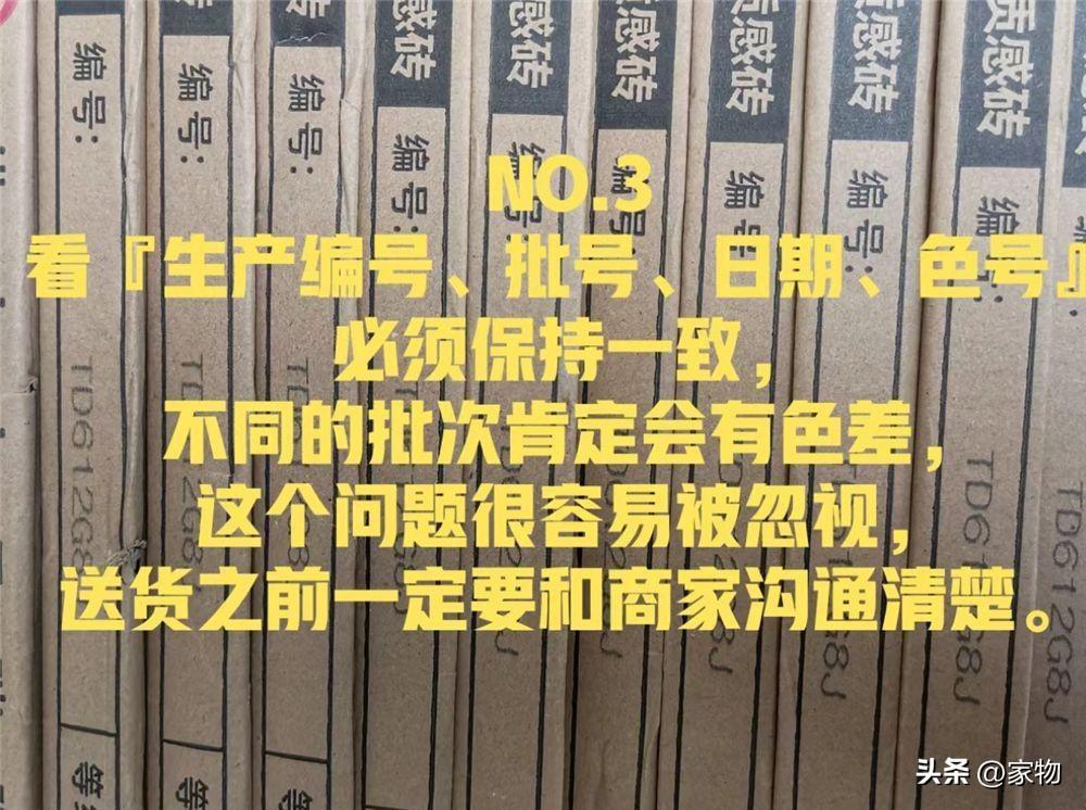 瓷磚到了家裏,我建議也要看一看最主要的四個數據,即生產編號、批號、日期和色號是否一致,最好是同批次且生產日期比較新的,如果相差太多,很容易出現色差的問題。