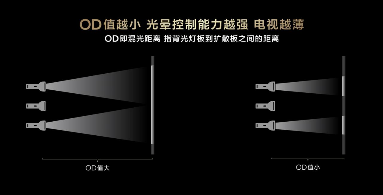 很多人一定是第一次聽到OD。科普一下,OD就是電視背光燈板到擴散板的距離。OD值越小,發光面越聚焦,與規劃分區大小越匹配,光暈控制能力越強,電視畫質越好。機身也越薄。也就是說,對於Mini LED電視來說,不解決OD問題,做薄就是天方夜譚。