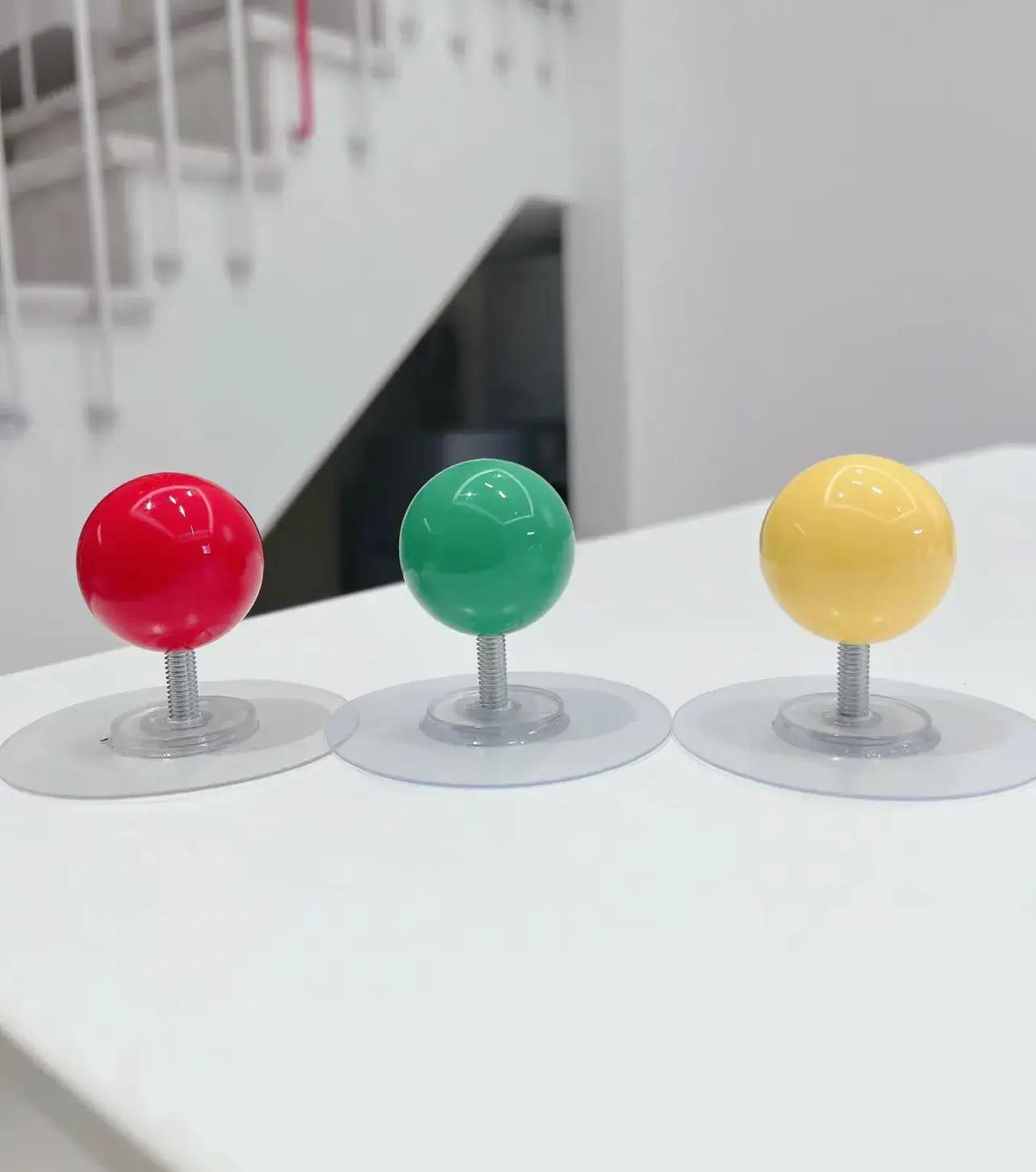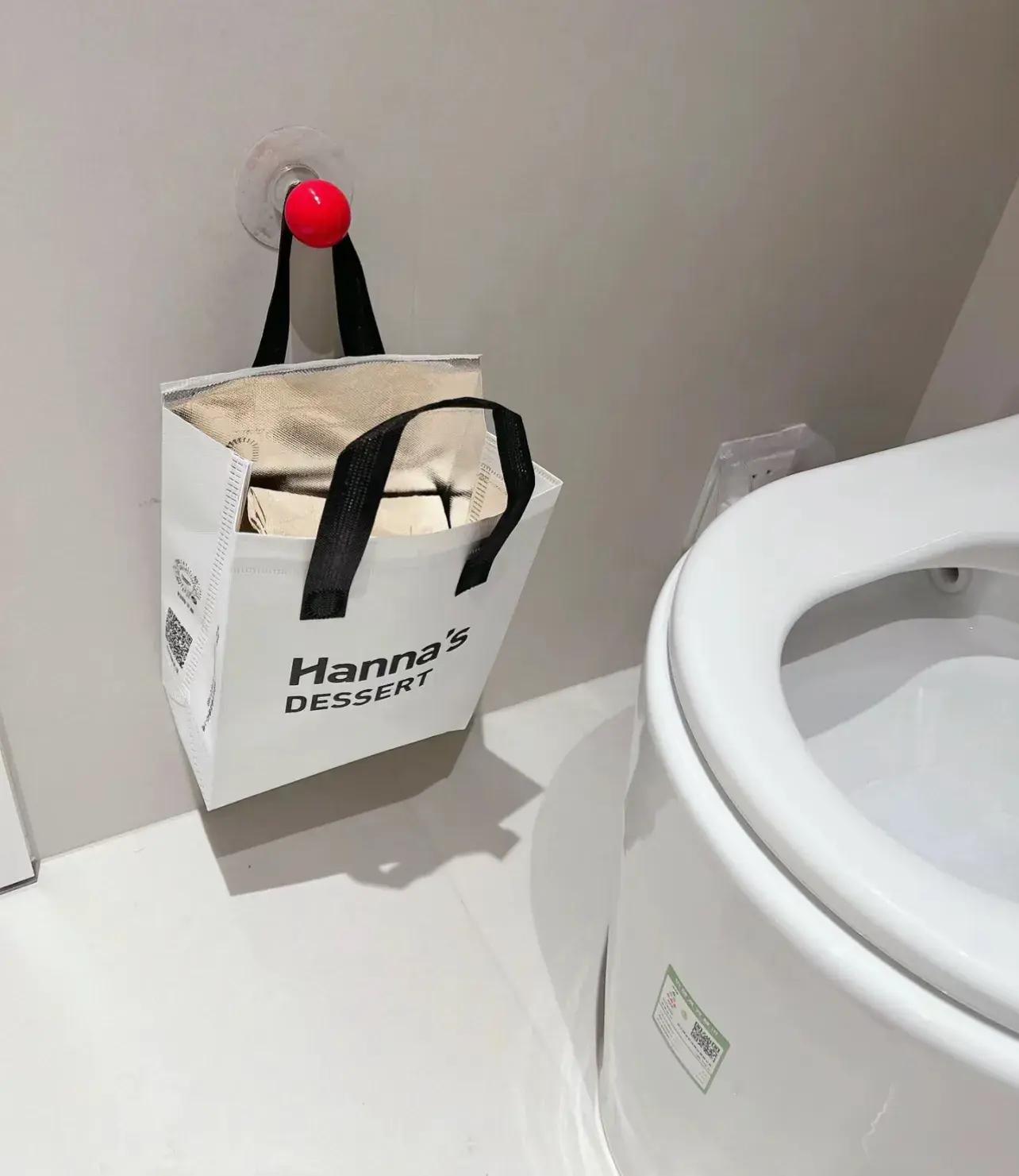 底下透明的玻璃膠貼,上面配上圓溜溜的小球,貼在衛生間,掛上垃圾袋,就是一個建議的壁掛垃圾桶。