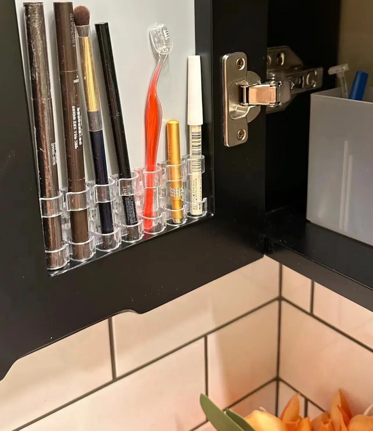 家裏剛好有一板未用完的理線器,鏡櫃內側又有凹槽,把這些理線器縱向貼在這裏,來收納眉筆、刮眉刀等小件物品,簡直不要太合適。