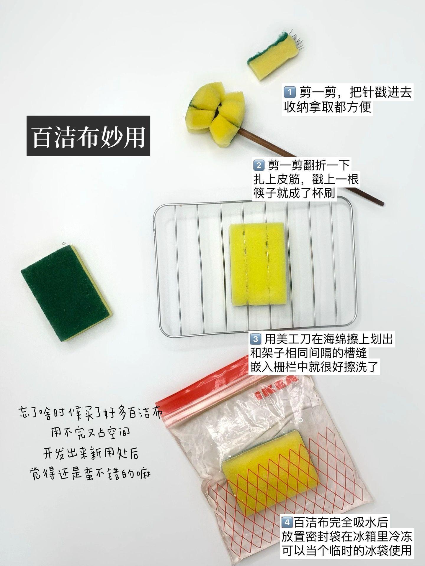 黃色面洗碗、吸水、擦桌子、擦玻璃樣樣精通,綠色面可以刷鍋、刷檯面,甚至可以洗鞋子、做開荒保潔。像上圖和下圖展示的,還有更多用法~