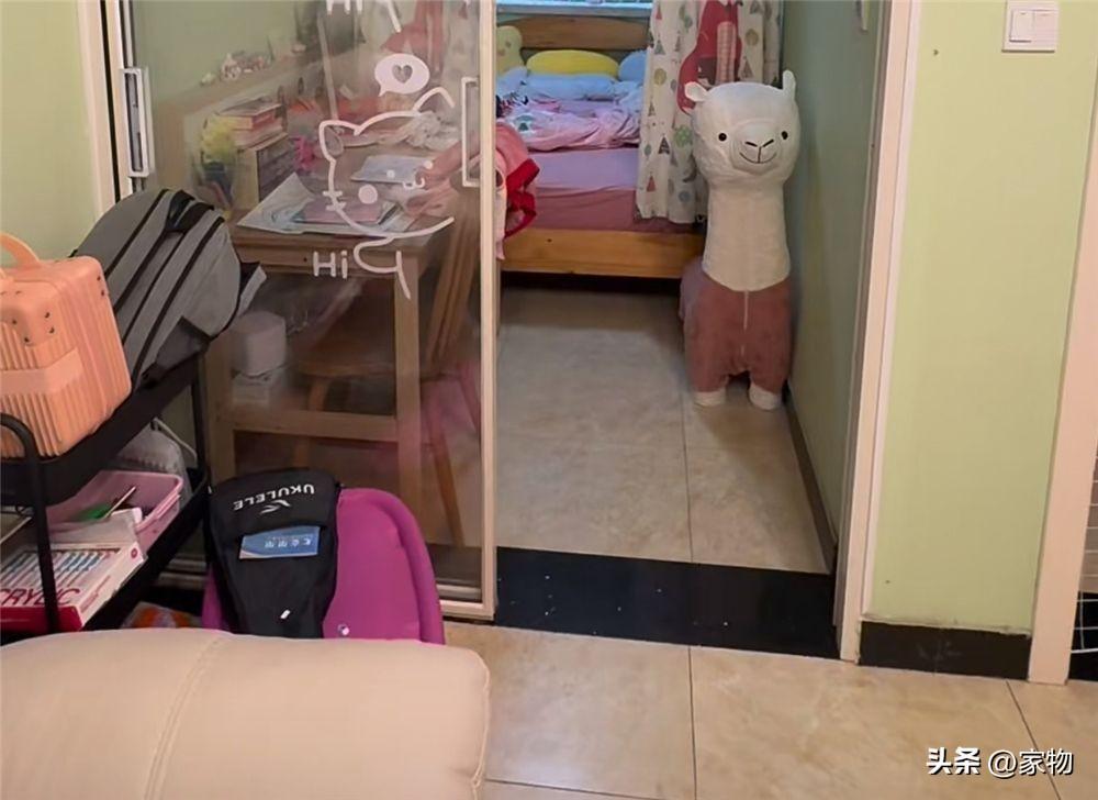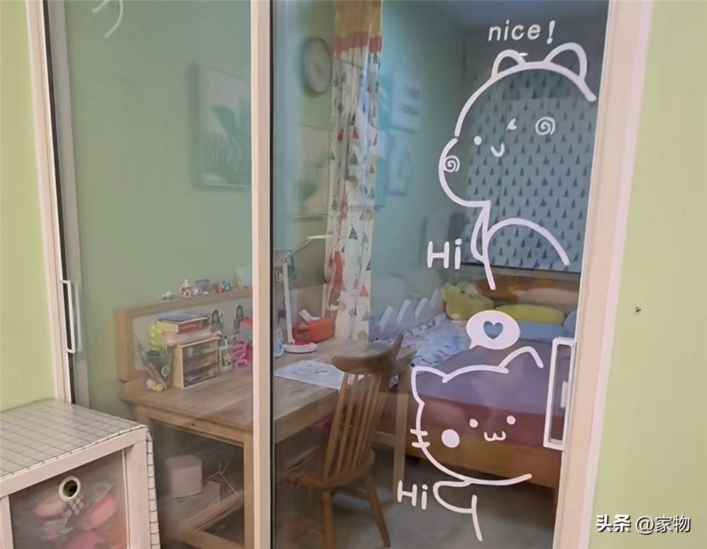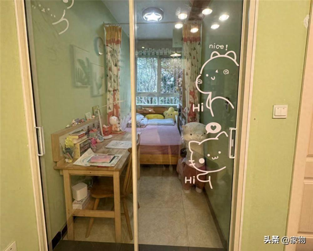 目前,這間4㎡的次臥室只是被當成了她的小書房,沒有什麼需要隱私的需求,後面如果有了孩子,在玻璃推拉門上加道簾子就行。
