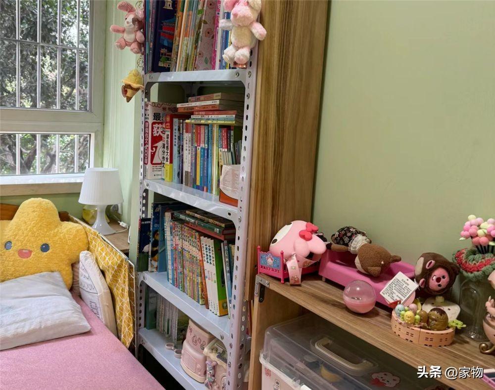 其實外側是一個窄櫃,還是這位姑娘自己做的,它本身底部帶輪子方便抽拉,但因爲現在塞下了各種毛絨玩具和雜物,滿滿當當已經抽不出來了,可以當成一個小收納櫃。
