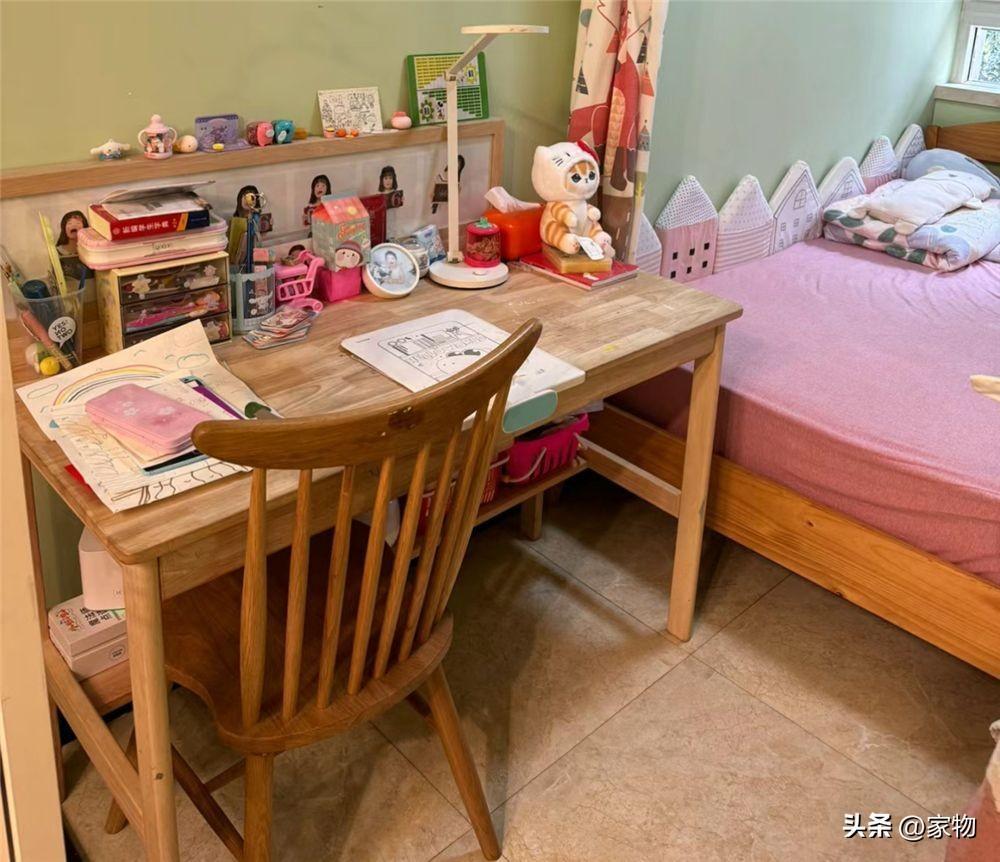 一進門的位置,書桌基本上是緊貼推拉門和另一側的牀尾擺放,桌面上有各種各樣的裝飾擺件,雖然看起來東西不少,但卻給人一種亂中有序的感覺,收納整理很到位。