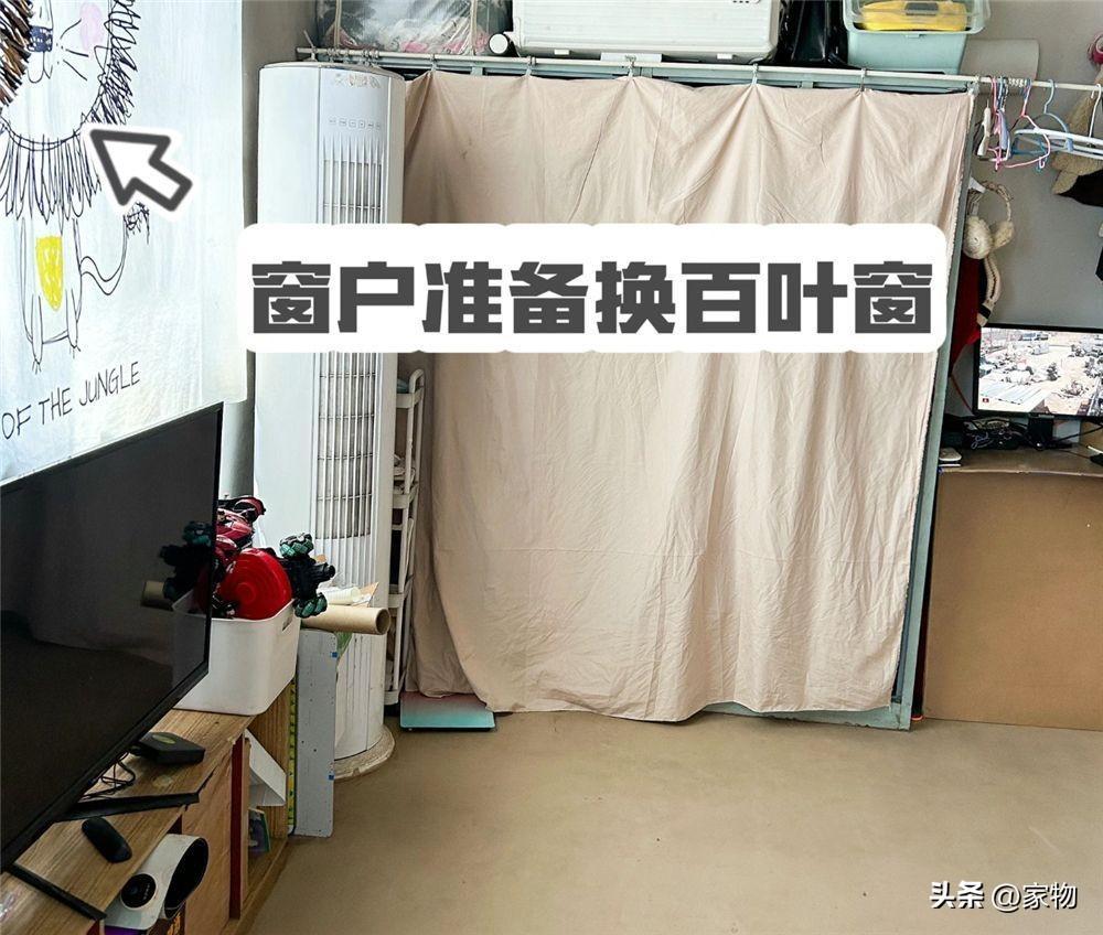 牀鋪對面做成電視牆,上面的窗戶用卡通圖案當窗簾,雖然簡單幹淨,但問題就是遮光太差,不僅看電視有影響,想睡個懶覺都會被光線“叫醒”,後期兩人打算將這裏換成百葉窗。