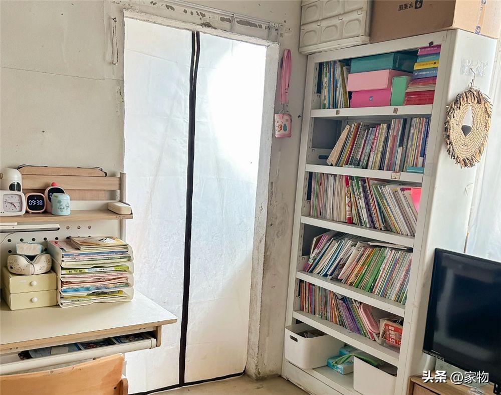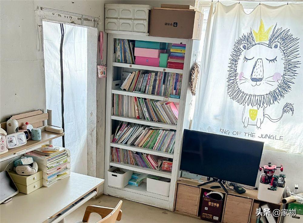 電視櫃旁邊,做了一個和門框同高的書架,六層架身,收納着兩個孩子滿滿當當的學習資料和圖書繪本,需要的時候就從這裏拿,平日裏看上去東西雖然很多,卻是亂中有序。