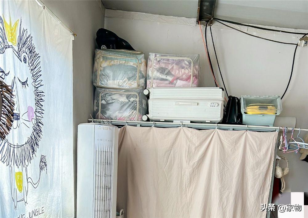 轉過身來,角落中是家裏最主要的收納空間,一組簡易衣櫃用簾子隔斷,上面堆滿了行李箱和各種衣物收納袋,看起來滿滿當當地,幾乎快放到了天花板,一些換季衣物被褥和生活用品,都會塞在裏面。