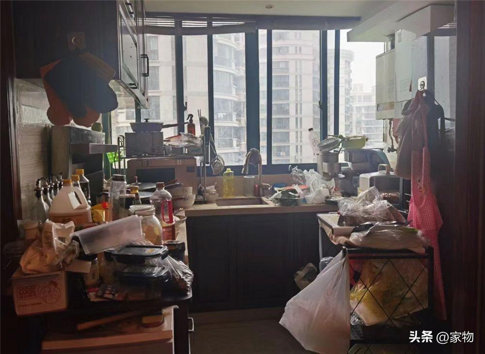 餐桌和廚房的雜亂狀態,比起客廳也是不遑多讓,倒不如說家裏的餐桌和廚房,早已經是名存實亡的狀態,餐桌上堆放着各種各樣的垃圾雜物,新買來的水果也只能放到邊角上。