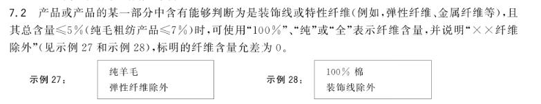 這看似矛盾,實則是可以理解的,我們可以看下最新國標GB/T 29862-2013第七條第二點對此的詳細解釋:產品或者產品的某一部分能夠判定是裝飾線或者特性纖維,且總含量≤5%(純毛粗紡產品≤7%)時,可使用“100%”“純”或“全”表示。但是需要說明“xx纖維除外”