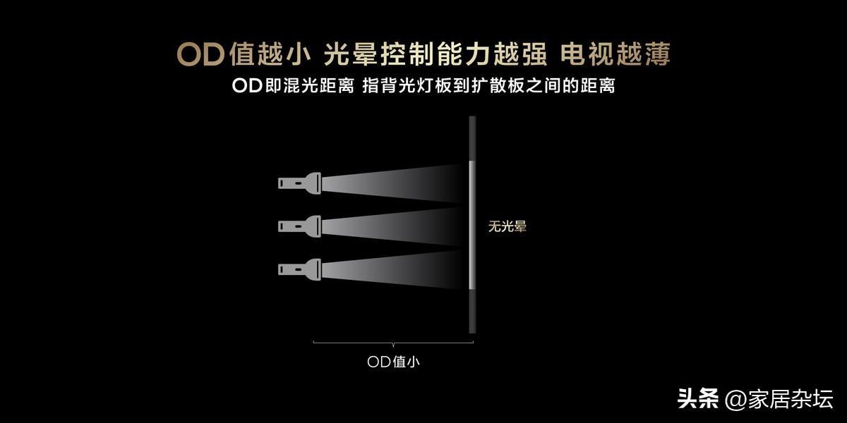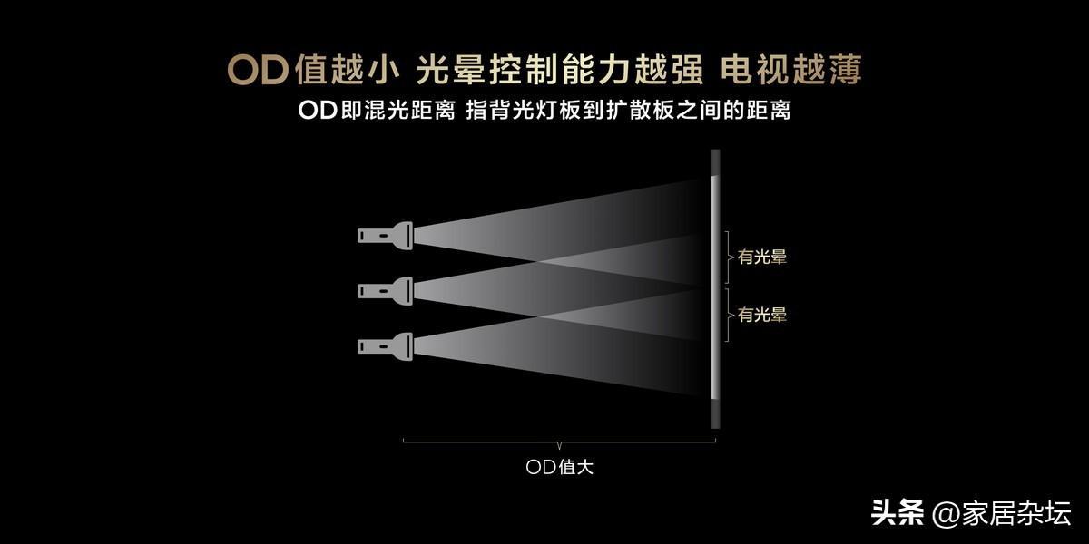 OD值指的是背光燈到擴散板之間的距離,也叫做混光距離。OD值越小,混光距離越短,相鄰背光分區就不會存在相互干擾的情況,那麼光暈就能得到有效控制,甚至不會出現。