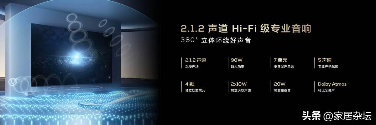 當然,這個策略是建立在高規格的音響系統之上。Q10K Pro升級了2.12聲道,功率不減,還將內部7單元升級到總計90W超大功率;背面也包含了20W獨立重低音單元,此外還有2個10W獨立天空聲道,能帶來沉浸感十足的音質體驗。