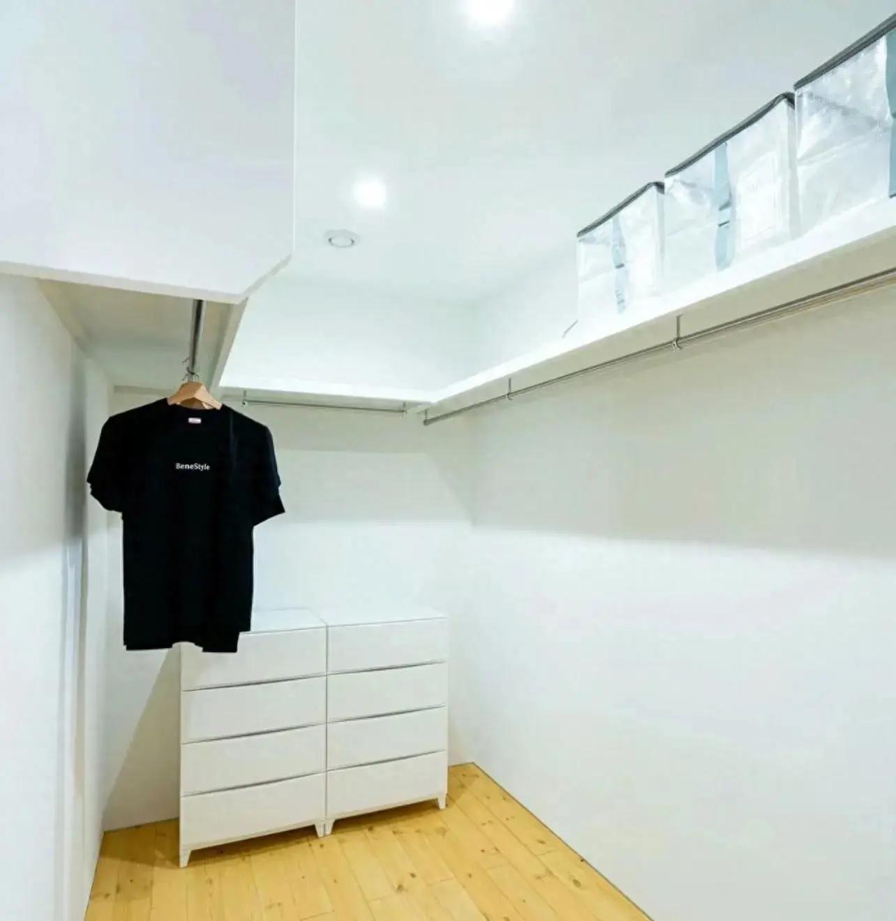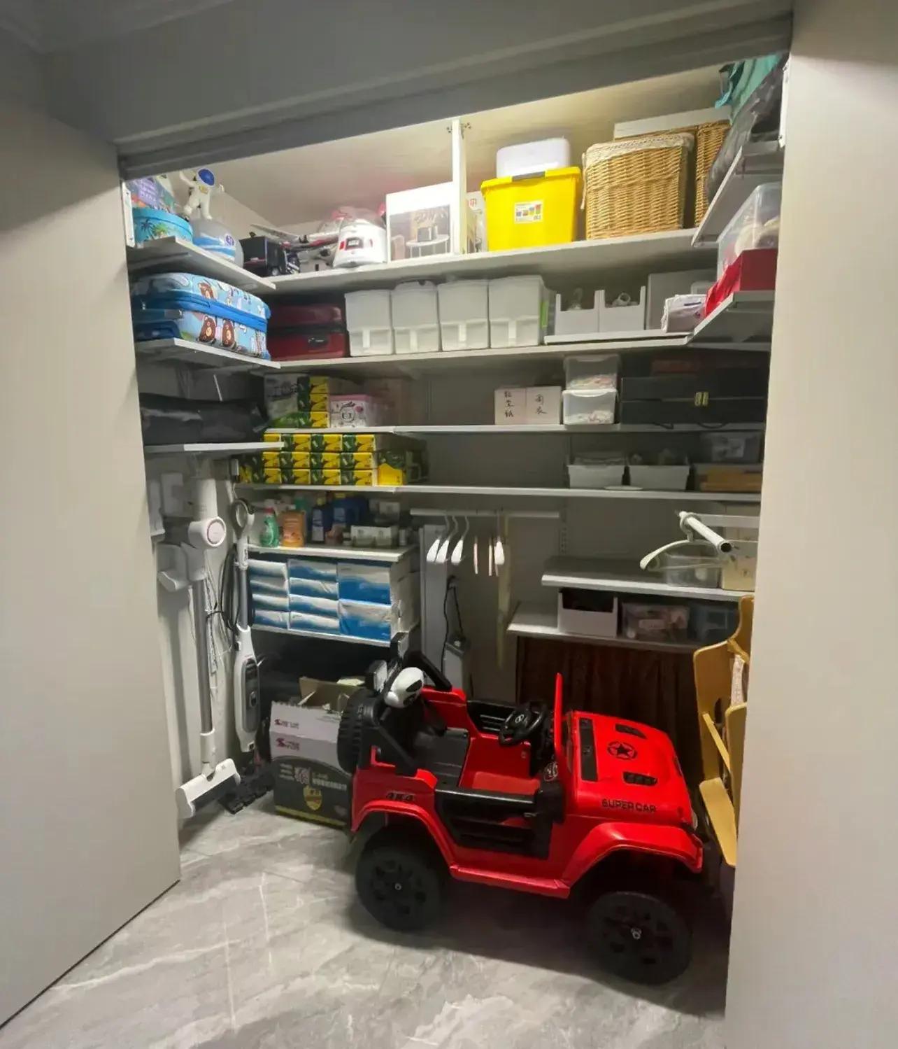 名字雖然裝,但不得不承認它是個實用設計,只比衣櫃多了20公分,卻能把家裏很多大件的東西都能塞進去了,比如推車、行李箱、小孩的自行車、小汽車、閒置的家電、囤貨……,門一關,隱藏看不見,可以很大程度上保證家裏的整潔度。