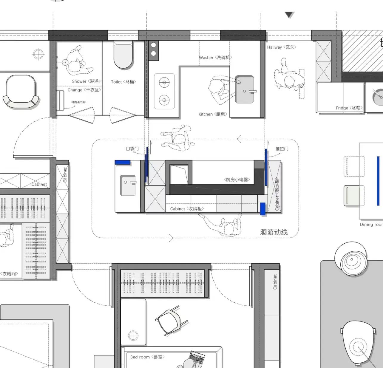 如果餐桌靠牆,那人就只能從不靠牆的一側通過,那就不是洄游動線;