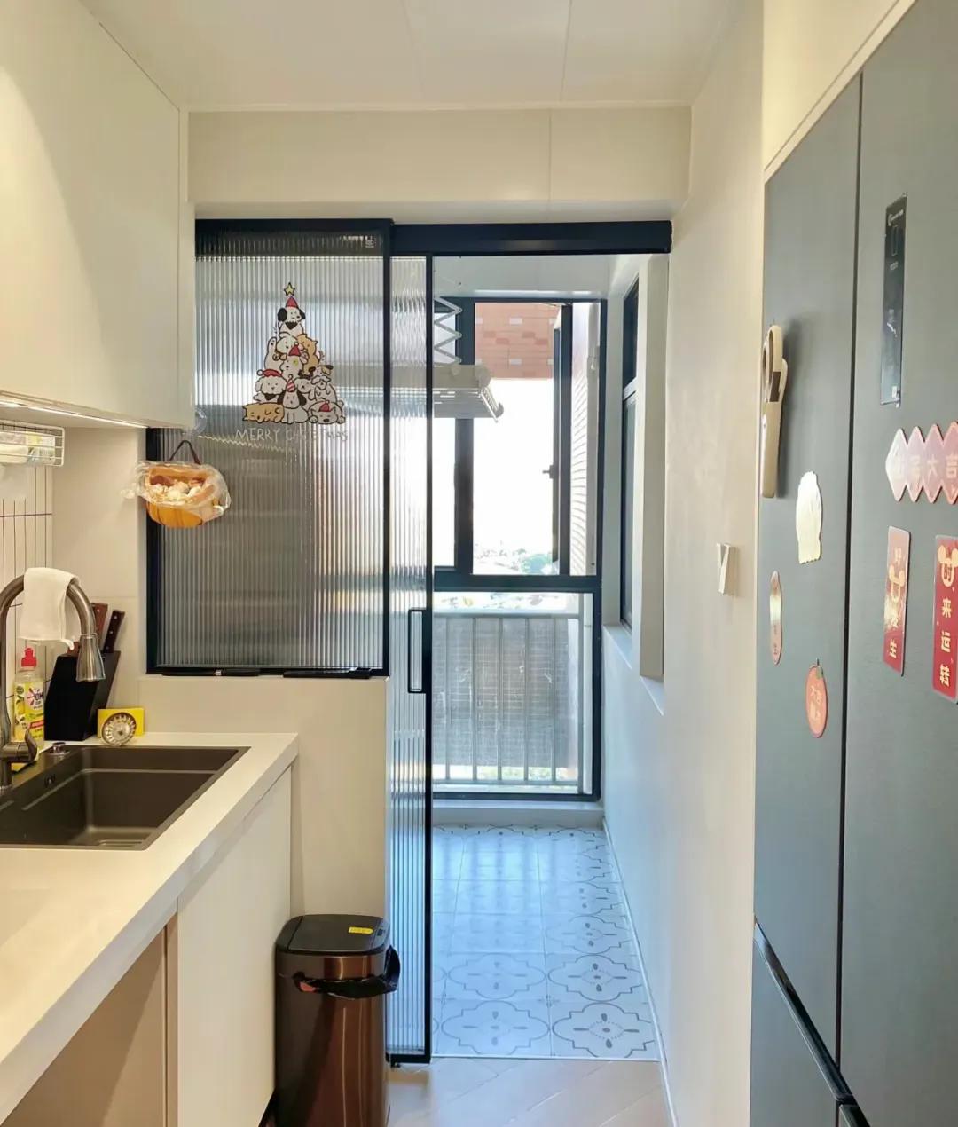 記得給陽臺和廚房做個隔斷,可以用通透性更好的玻璃門,不影響廚房採光,又避免衣服上沾染油煙。