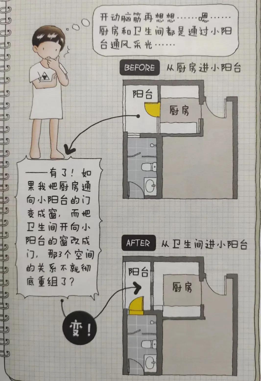 如果你家廚房陽臺恰好又與衛生間相連,那就更容易改造了。可以學習逯薇老師的方案,把這個小陽臺和衛生間打通,直接從衛生間進入陽臺晾曬,避免穿過廚房,是更合理省力的動線。