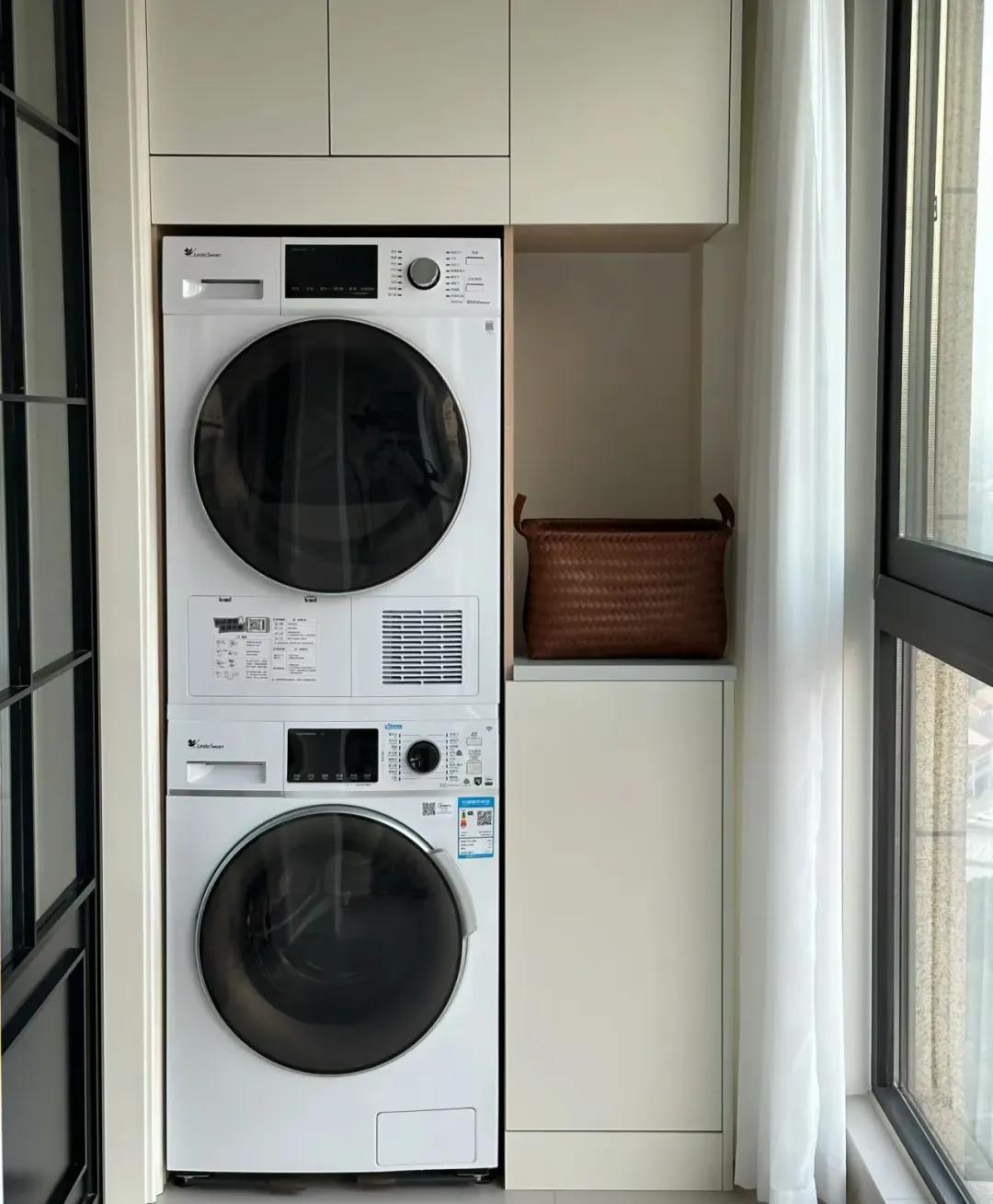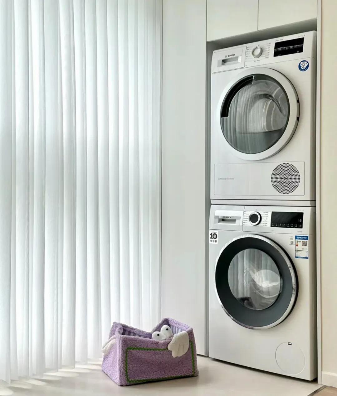 在陽臺安裝洗衣機之外, 再加一臺烘乾機,或者二合一洗烘一體機,洗完衣服烘乾,直接放入衣櫃。有了烘乾機之後,黃梅天再也不缺內衣襪子穿了!自然,也就不需要在陽臺晾曬了。