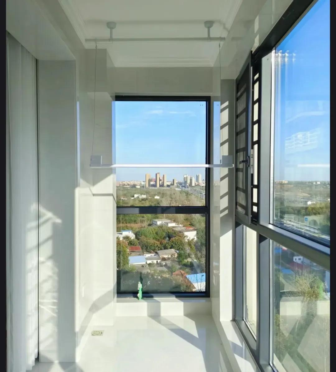 這個陽臺朝北,雖然光線沒有朝南好,但是南北通透的房型,一開窗通風,衣物也會很快吹乾。