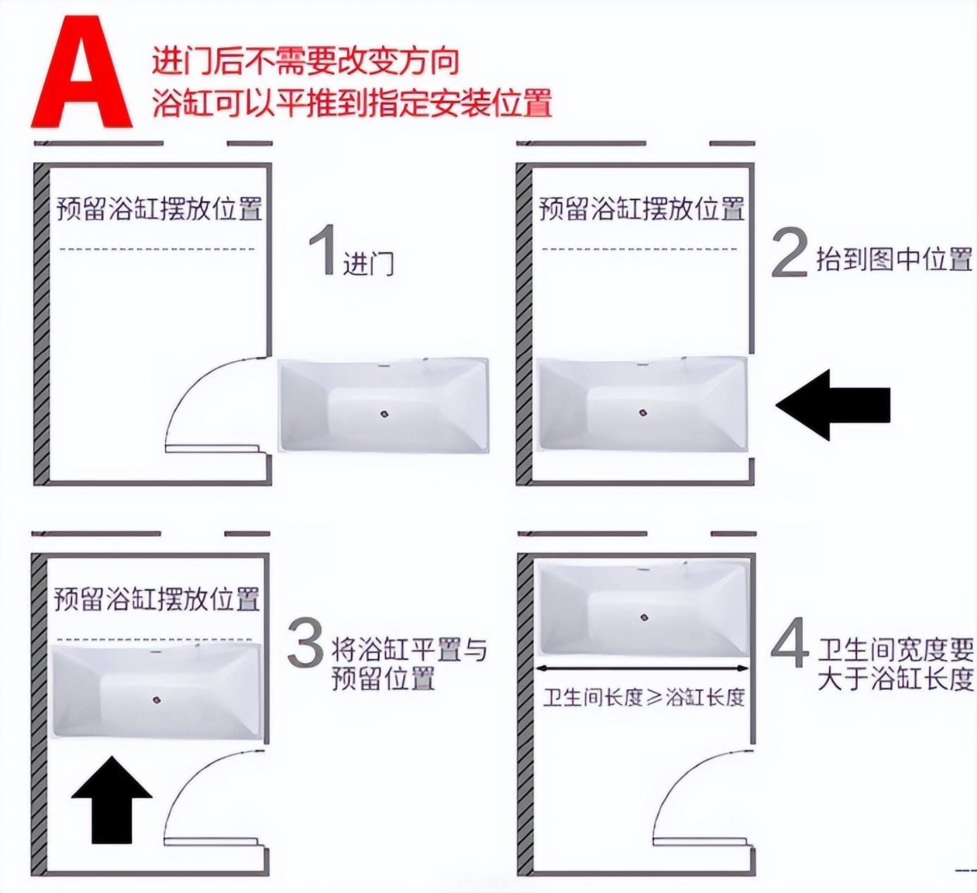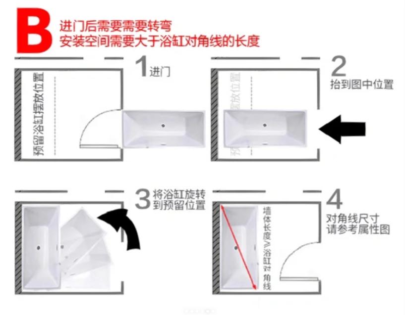 再此劃重點:進門旋轉需要看浴缸對角線長度,該長度要小於浴室內寬度。浴缸進去的兩種常規方式: