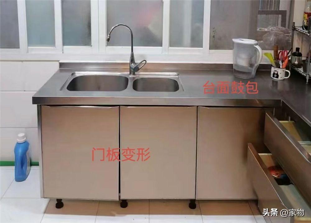 大家別誤會,不鏽鋼櫥櫃的防水和堅實程度沒得說,這裏所說的耐用性,一方面是它容易氧化的問題,另一方面也是容易出現鼓包變形的情況,尤其檯面部分,不鏽鋼櫥櫃用時間長了,沒那麼平整也是習以爲常。