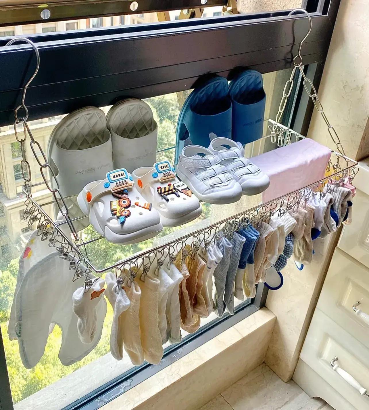 相比普通晾曬架,它兩邊是軟鏈+掛鉤,可以掛在窗框上,晾曬視覺面降低後,凌亂感也就不那麼強了。