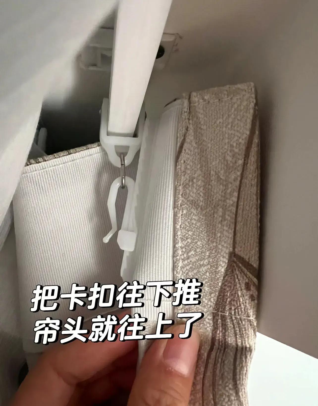 窗簾長了,就把卡扣往下推,簾頭就往上提了,反之,如果窗簾有點短,就往上推,向下放長度。