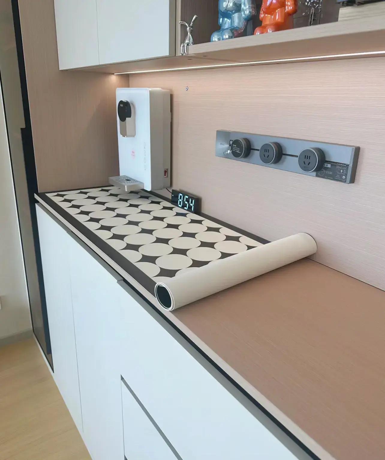 裝修時,光想着餐邊櫃上裝軌道插座,後期各種飲水設備、小家電使用方便,但忽略了板材長期接觸水汽會變形的問題。