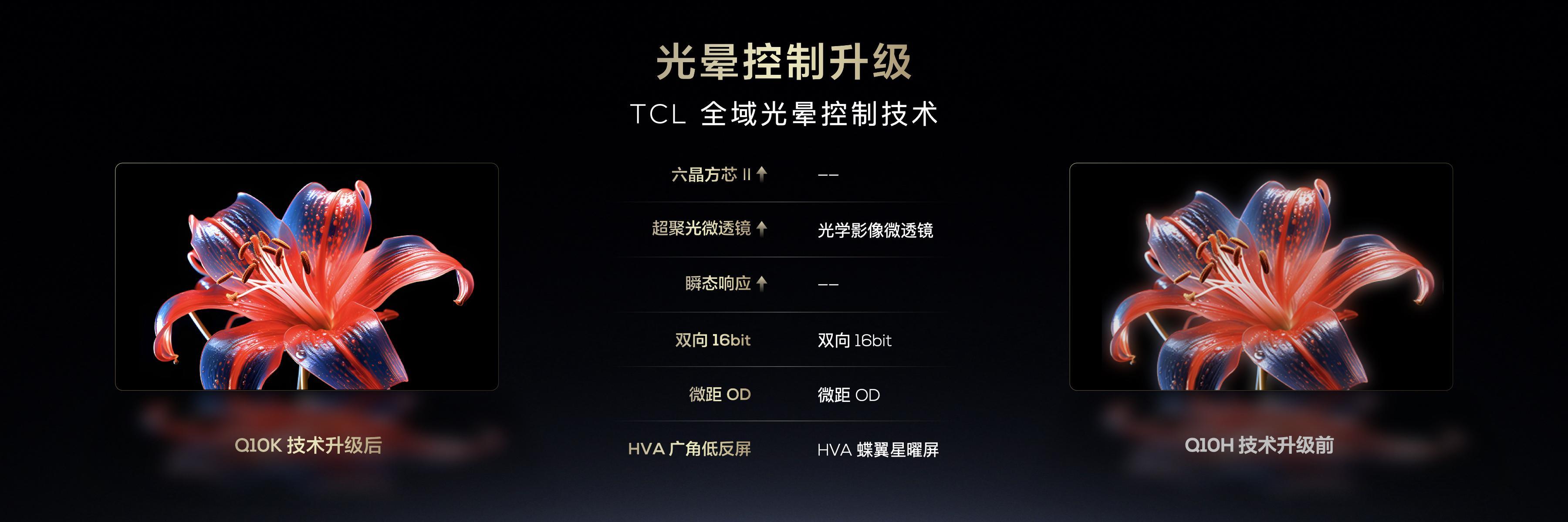 爲了進一步提升畫質,TCL爲Q10K配備了獨有的全域光暈控制技術,通過六晶方芯II、超聚光微透鏡、瞬態響應和雙向16bit、微距OD、HVA廣角低反屏等先進技術,徹底終結了光暈問題,並且還將極大程度改善了殘影、拖影等影響觀感體驗的問題。對於用戶來說,Mini LED在畫質上的升級,就是無論播放什麼類型的電影,都能帶來更生動沉浸的觀感體驗。