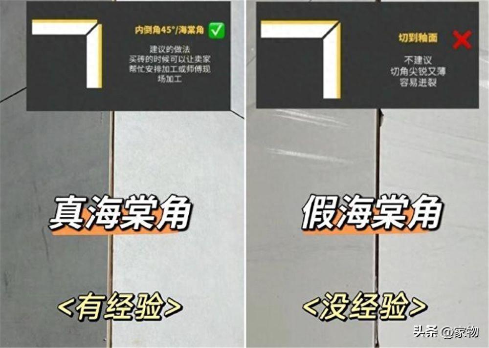 當然,有時候看到瓦工師傅切成內倒角45°的海棠角,瞬間就能明白,這是位有經驗的師傅,完全一刀下拉力的切角做海棠角,反而沒留美縫的地方,還容易崩。