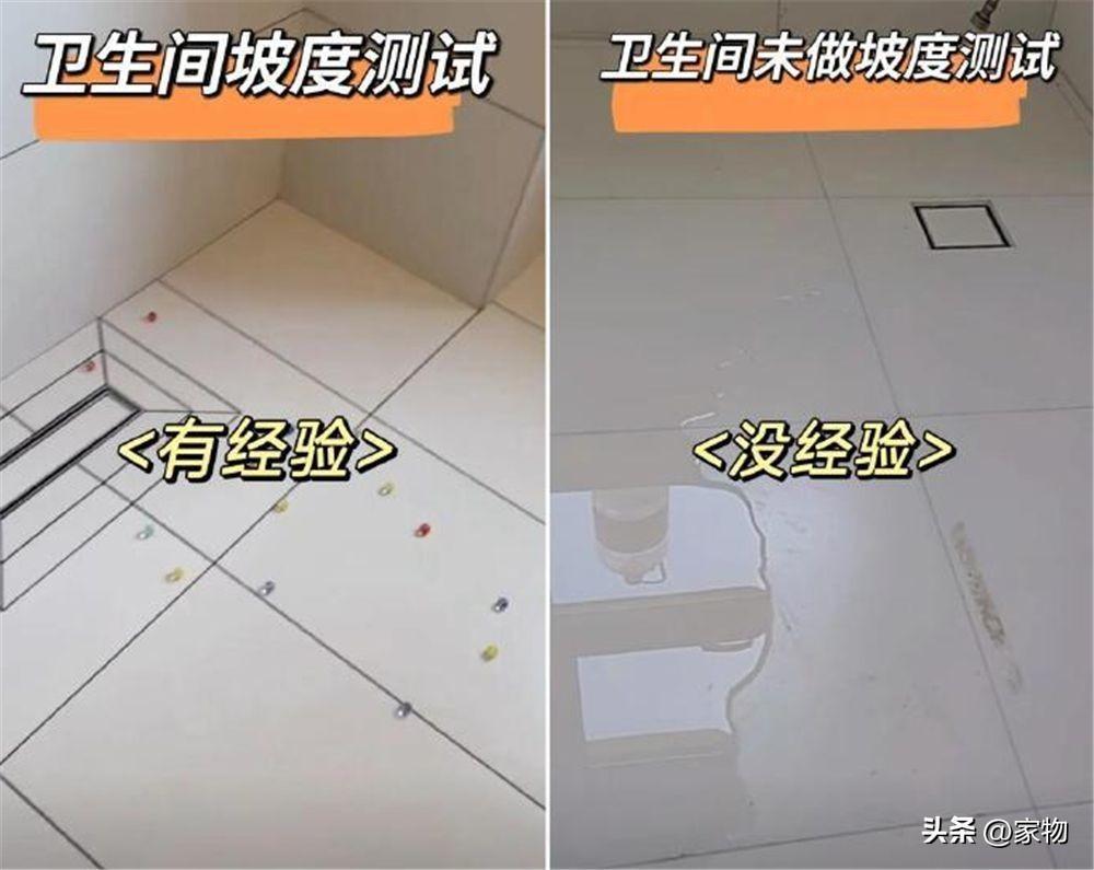 衛生間坡度測試,按理說並不需要等到監理來了再做,負責任的瓦工師傅做好坡度後,都會自己檢查一下,這關乎到日後衛生間是不是會積水,一點也馬虎不得。