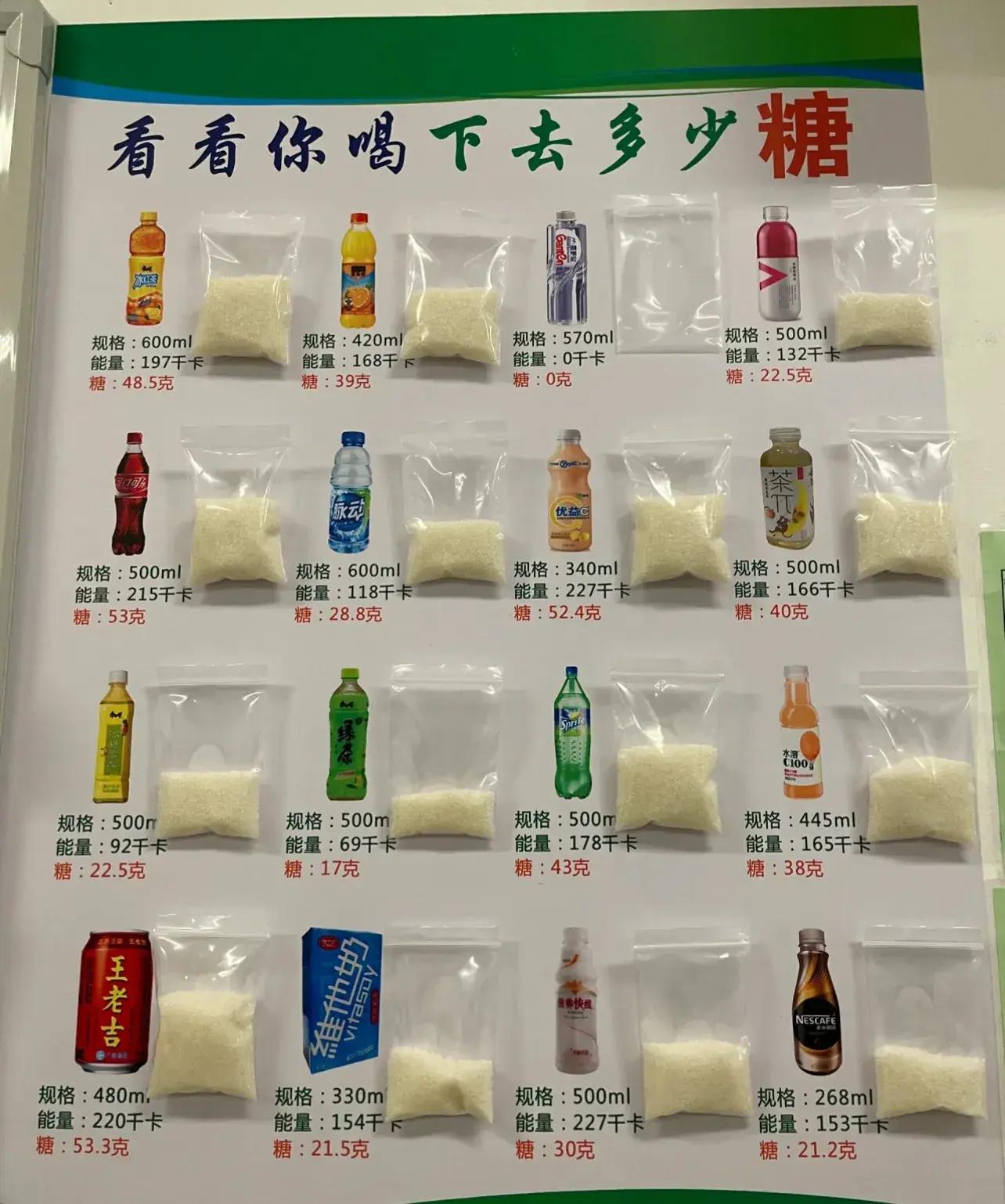 如果這還不夠直觀,再看看各種飲料的含糖量,這都直接可以用震驚來形容了,打死我也想不到一杯飲料下肚等於喫進去大半袋糖吖~