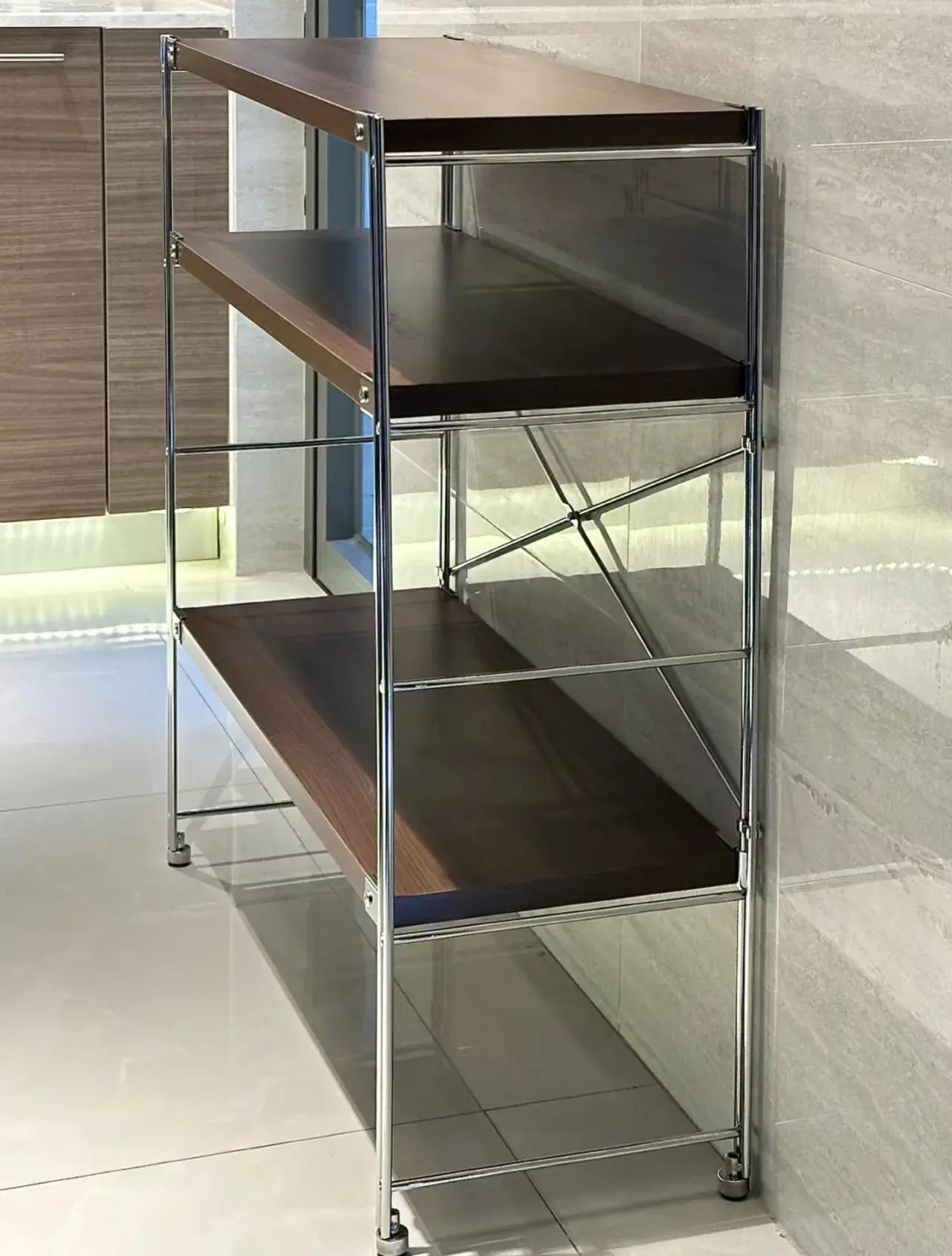 當然,這個廚房的擴容收納架,可選擇的範圍很大,各種款式、造型、材質的都有,但迄今爲止,我所見到過最漂亮、最有質感的,還是這個胡桃木+金屬主架的。