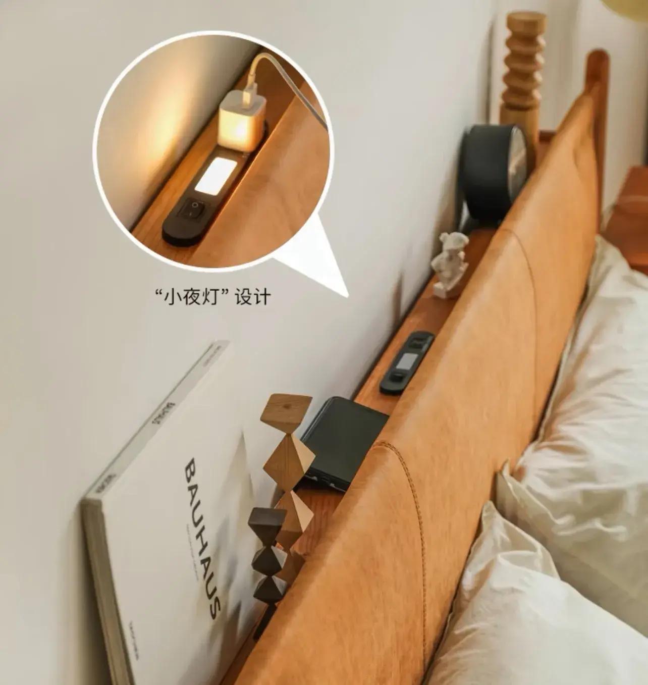 不僅能多放很多東西。還貼心的增加了夜燈和插座的設計,方面給手機充電,重點是睡在裏面的人,再也不用爬過一個人,去牀頭櫃上夠手機了。