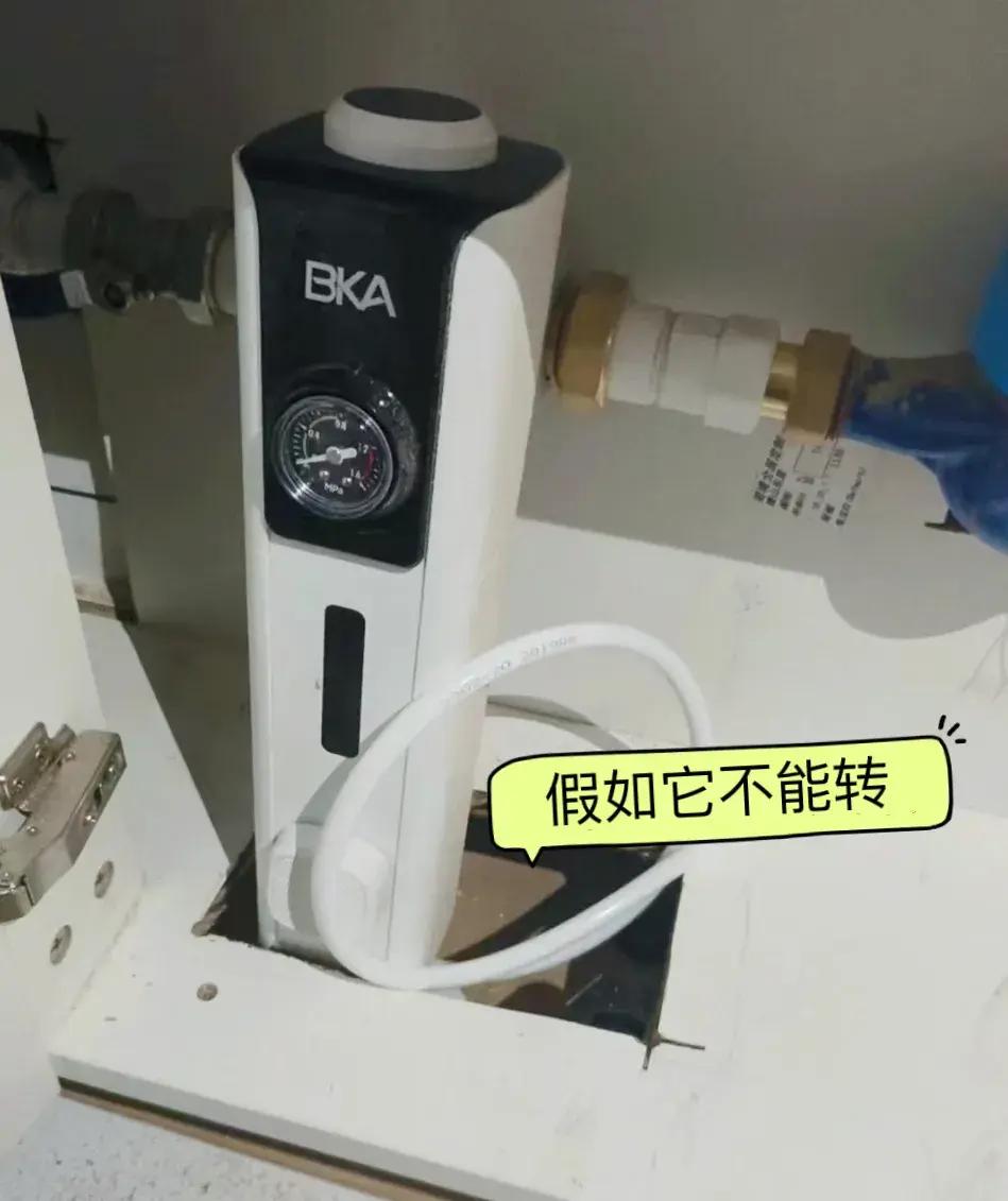 可假如,你沒提前考慮前置過濾器,再碰上個不能轉的前置過濾器,那要不就改水路,要不就得如上圖,好好的櫃子被裁開。