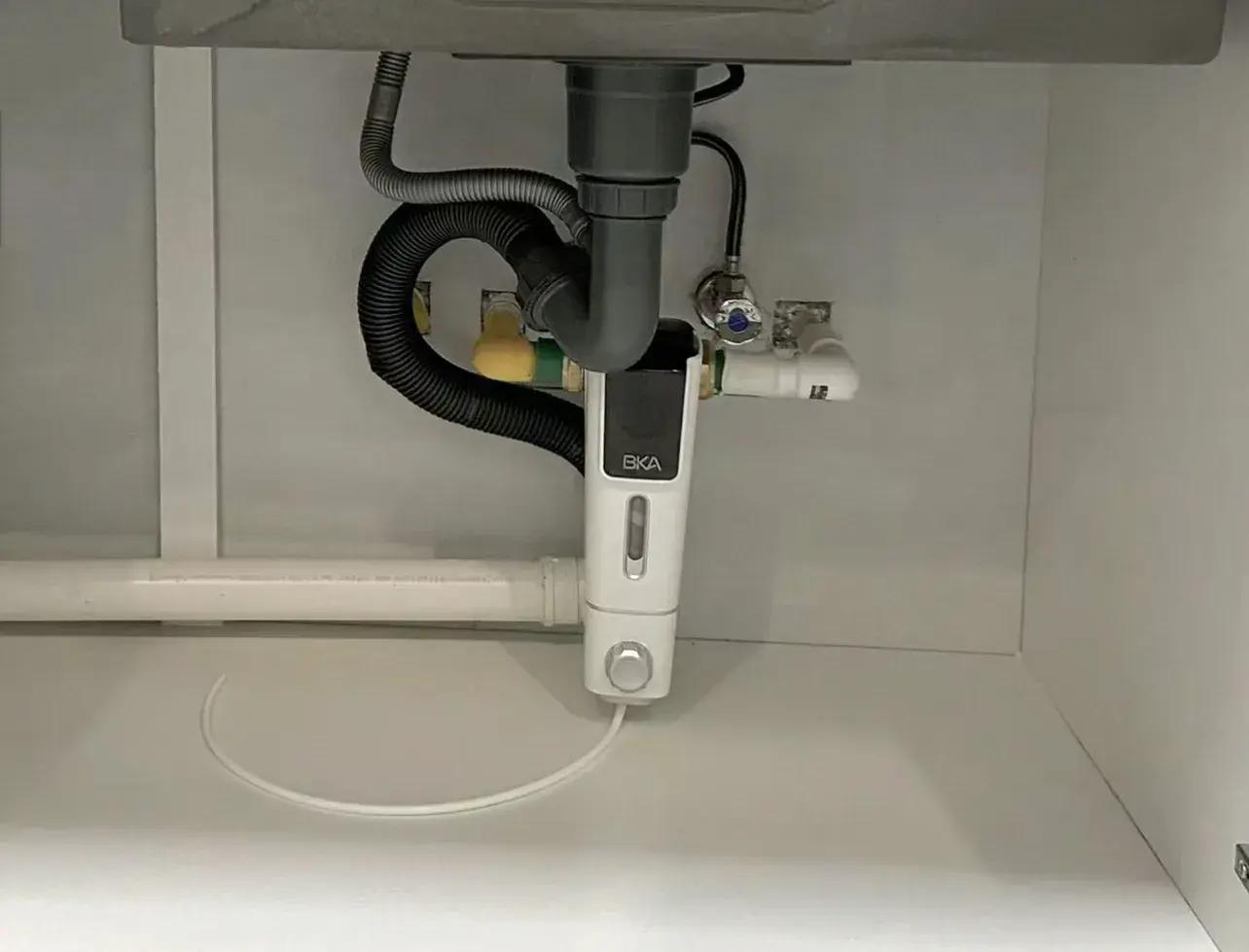如果提前考慮了前置過濾器,那萬向過濾器沒用,因爲你可以提前做好水管設計,讓前置過濾器可以如上圖一樣,舒舒展展的裝在水槽櫃裏。