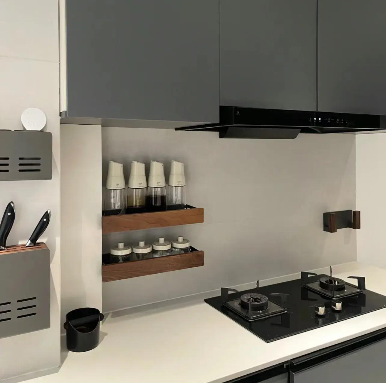 因爲胡桃木,變得美觀度直線飆升,大大的增加了,壁掛收納的展示屬性,如果再能像上圖一樣,把油醋、調料瓶統一一下,就能很好的規避置物架的最大缺點——顯亂。
