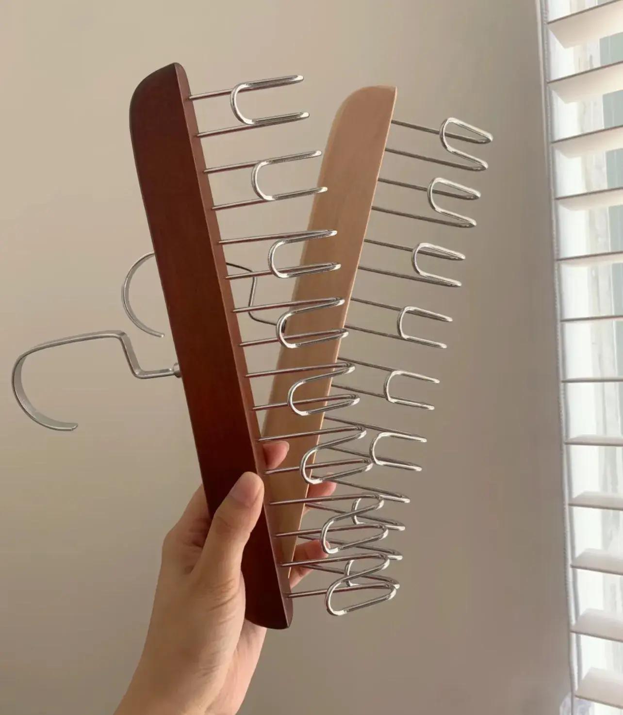 一個衣架上有許多鉤子,可以把小件的衣物全給掛上去,既節省衣櫃空間,又方便了拿取。