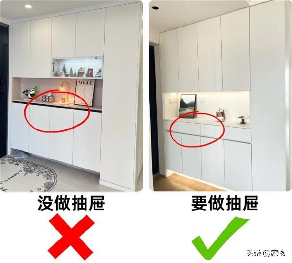 若是玄關櫃沒做抽屜的話,那麼櫃子就會出現櫃面凌亂,雜物無處安放的問題,久而久之,玄關的整潔便再也不見。
