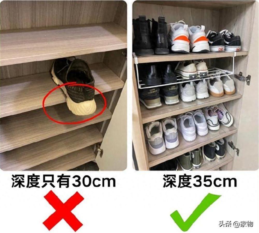 我就看過很多鞋櫃的尺寸,隔板內深度居然只有30cm,這個深度能做什麼呢?最多不過放下女士的鞋子罷了,稍微大一些的鞋子,就會多出一截,要麼關不上櫃門,要麼只能斜着放浪費空間。